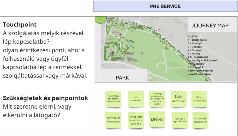 A Humusz Szövetség szakembereivel egy CX-alapú journey mapping workshop keretében kétszer másfél órás blokkokban közösen határoztuk meg azokat az érintkezési pontokat (touchpoint), amelyeken keresztül a látogatók a találkozó helyszínére érkezve kapcsolatba lépnek a rendezvénnyel és a szervezőkkel.