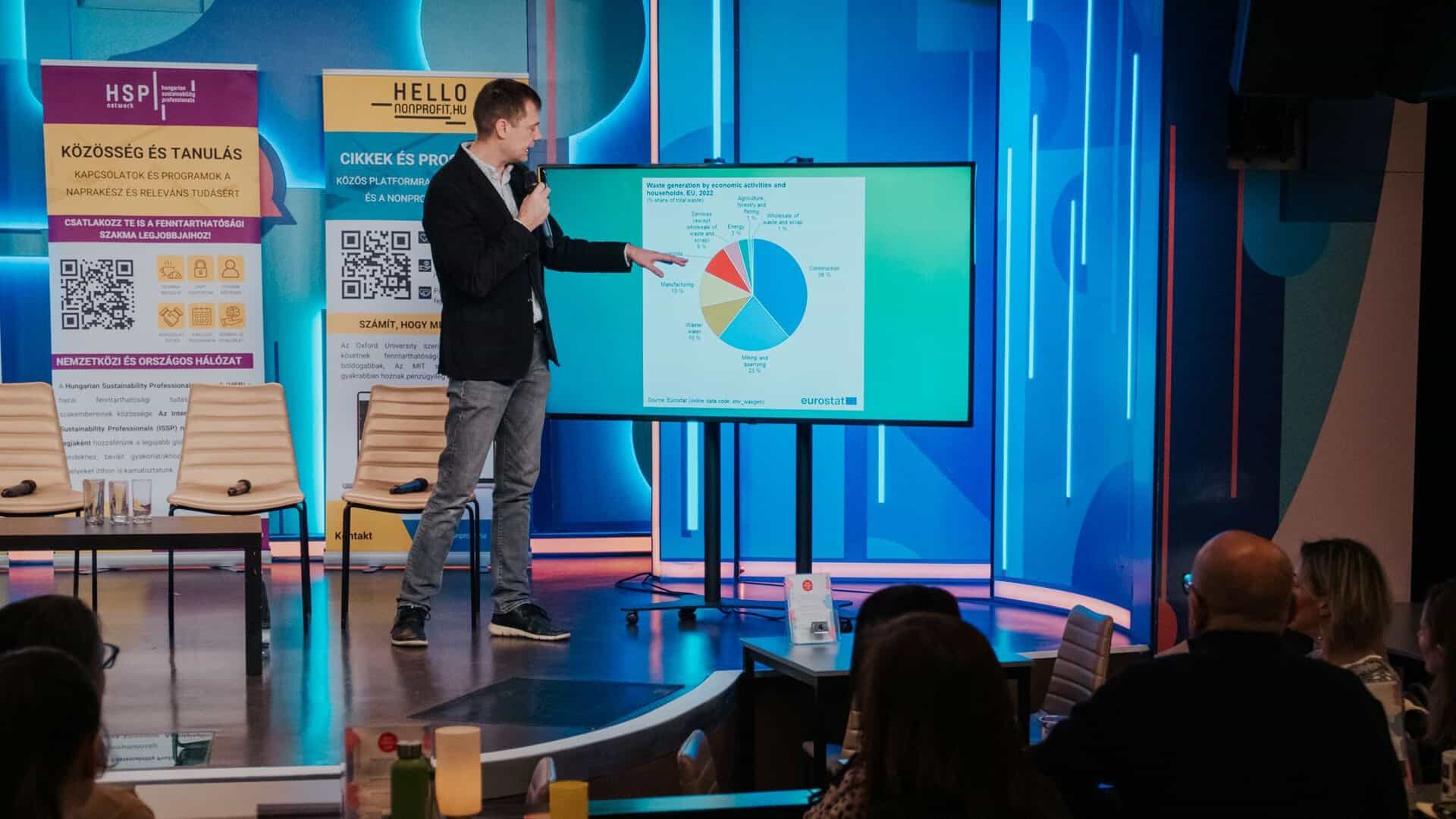 A bevezető előadást a szakmai közösség tanácsadó testületének tagja, Litkai Gergely jogász, humorista tartotta, aki olyan számadatokra hívta fel a közönség figyelmét, amelyek kontextusba helyezik a hulladékgazdálkodás és a körforgásos gazdaság aktuális kihívásait. Litkai röviden ismertette a 2024-es Circularity Gap Report megállapításait, melyek szerint minden intézkedés ellenére tovább nő a természetből kinyert anyagok tömege és ezzel együtt a megtermelt hulladék tömege is. Az Eurostat adataira hivatkozva felhívta a figyelmet arra is, hogy az Európai Unióban a legnagyobb mértékben az építőipar termel hulladékot (38%), ami kiemelt felelősséget ró az iparágra.