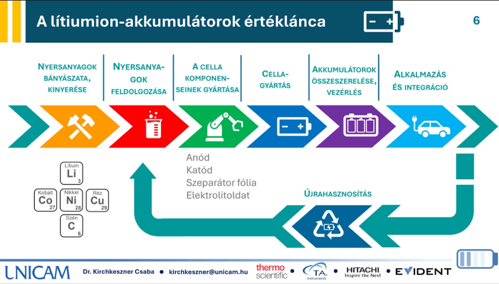 Az UNICAM képviseletében Dr. Kirchkeszner Csaba tartott előadást arról, hogy milyen fontos szerepe van a modern és korszerű műszeres analitikának az akkumulátorgyártás és újrahasznosítás során ahhoz, hogy fenntartható és biztonságos folyamatok mentén járjunk el. Gépi analitikával egyszerűen elvégezhető például a maradék szén és kén jelenlétének, illetve az NMP maradékának vizsgálata a gyártás és felújítás során. Ez utóbbinak alapfeltétele az oxigénmentes környezet, az argon-bevonatú kesztyű használata és egy távirányítású elemzőegység, amely a különböző lítiumsók jelenlétét, struktúráját és sérültségét méri, illetve azok reakcióképességét különböző környezeti feltételek mellett.