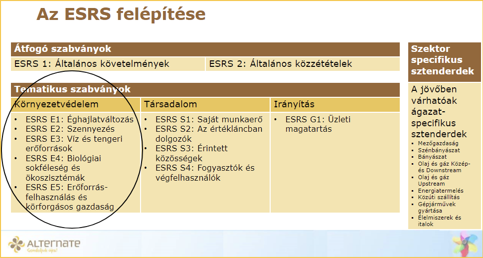 Az általános jelentéstételi sztenderdek és erre épülő EU-s és tagállami jogszabályok pedig a vállalatok ezirányú elköteleződéséről, tevékenységéről és eredményeiről szeretné egységes, átlátható módon beszámoltatni őket. Fontos megemlíteni, hogy az EU-s CSRD (Corporate Sustainability Reporting Directive) által használt ESRS jelentéstételi keretrendszer tematikus sztenderdjei között is öt környezeti tematikus sztenderd szerepel, előírva, hogy a lényeges hatások, kockázatok és lehetőségek függvényében fontos témákról milyen formában mutassa be a gazdálkodó szervezet az eredményeit.