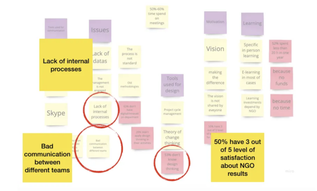 Az online kutatásból kapott eredmények alapján a 60 válaszadó 63%-a nyilatkozott úgy, hogy civil szervezetének nincs sem digitális, sem innovációs csapata, 53%-a nem ismeri a design thinking módszertanát, és 50%-uk 5-ből 3-as szintű elégedettséget adott a civil szervezete végeredményével és hatásával kapcsolatban.