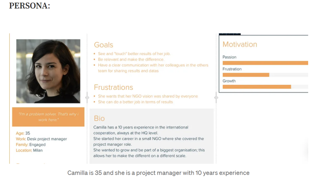 A választ egy perszóna személyén keresztül kereste, akit Camillának nevezett el. A perszóna alkotása egy jó módszer arra, hogy reprezentálja azt a célközönséget, akire a szolgáltatásunkat tervezzük. Általuk könnyebben érthetővé válnak a felhasználókkal való kapcsolatos információk és szükségletek, és rajtuk keresztül érthetőbben tudjuk modellezni azt a csoportot, akire tervezünk.